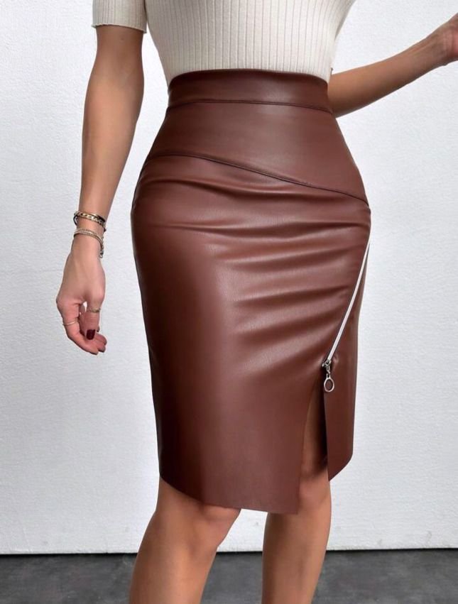 Kadın Yüksek Bel Yandan Fermuarlı Ve Yırtmaçlı Deri Etek