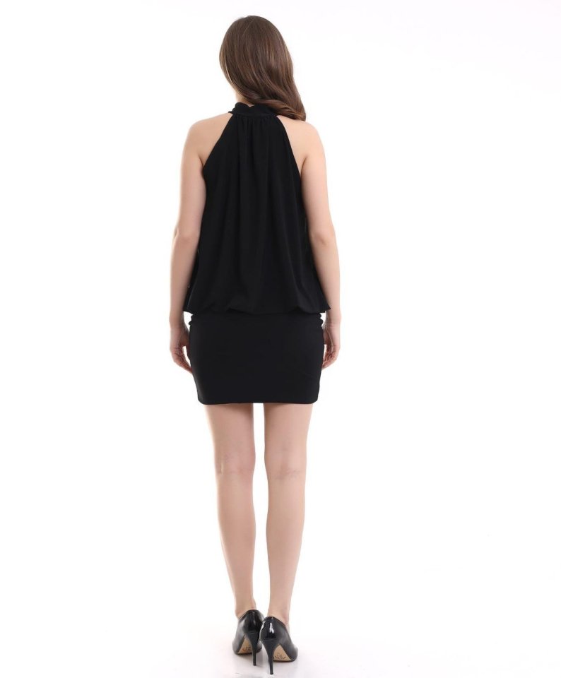 Kadın Yüksek Yaka Büzgü Detaylı Şifon Garnili Sandy Kumaş Fırsat Ürün Diz Üstü Elbise
