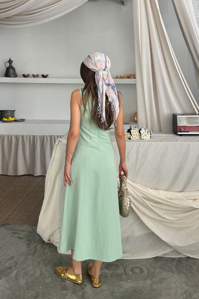 KETEN KOLSUZ KARE YAKA DÜĞME DETAYLI ELBİSE - Mint
