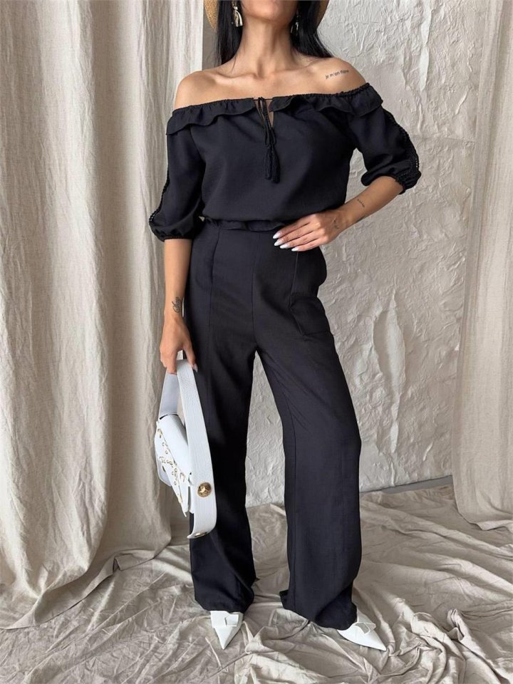 KETEN MADONNA YAKA KOL HASIR ŞERİT - PANTOLON TAKIM - Siyah