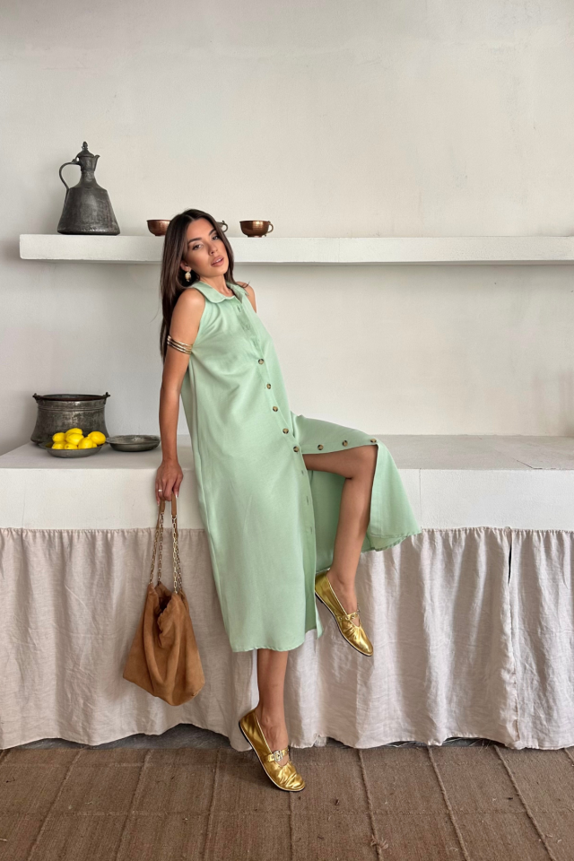 KETEN ÖNDEN DÜĞMELİ KOLSUZ GÖMLEK YAKA ELBİSE - Mint