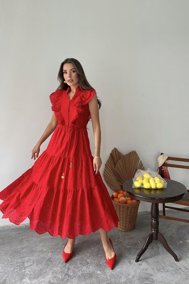 Kırmızı Fırfırlı Düğmeli Elbise