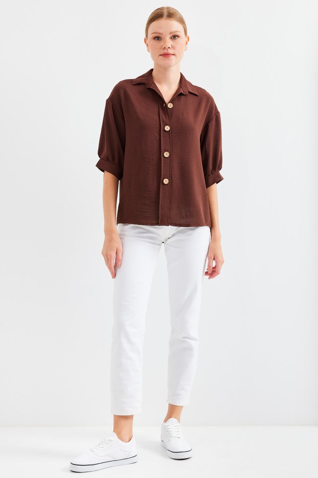 Kısa Kol Oversize Keten Gömlek 20240 - Kahverengi