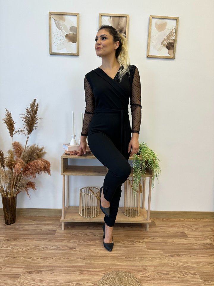 Krep Kumaş Kol Tül Puan Detaylı Kuşaklı Tulum 141 Cm