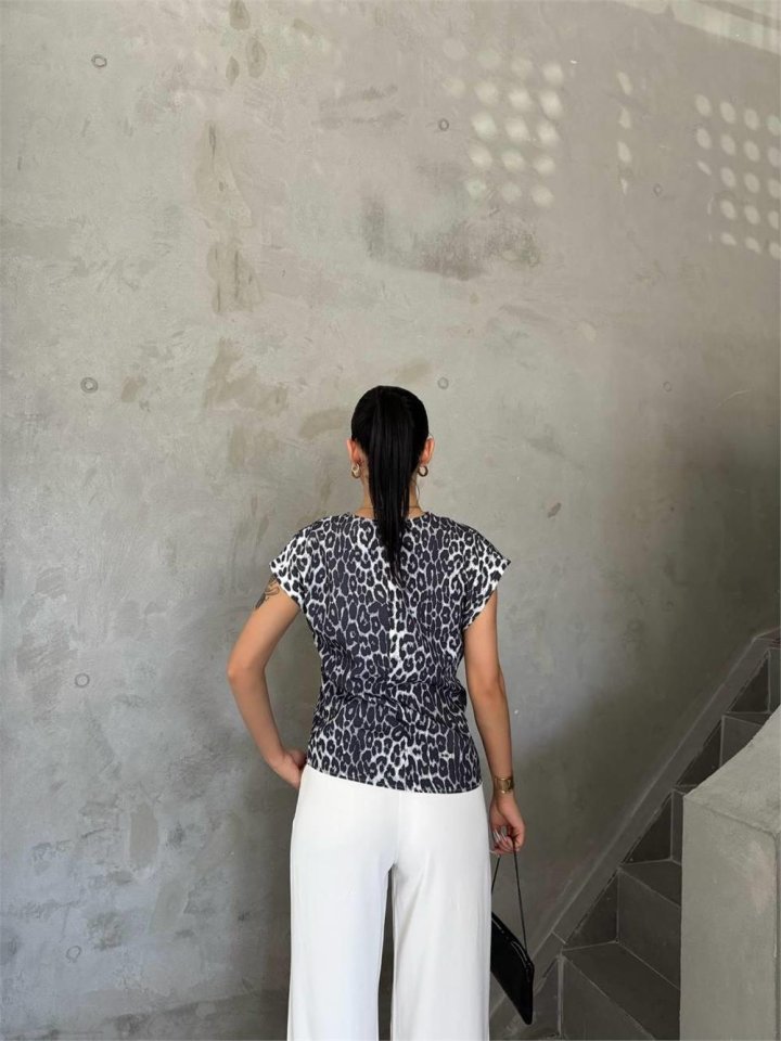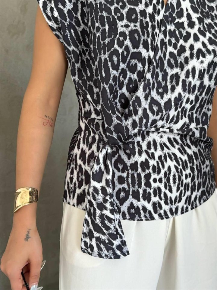 LEOPAR DESEN YANDAN BAĞLAMA DETAYLI BLUZ - Gri