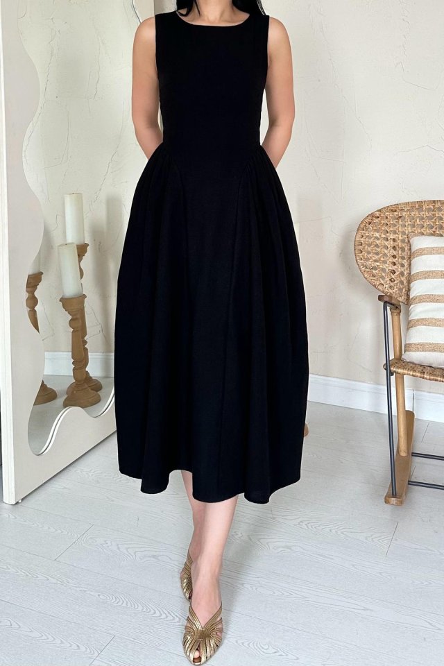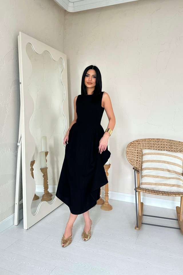Mavi Yanları Büzgülü Midi Boy Keten Elbise