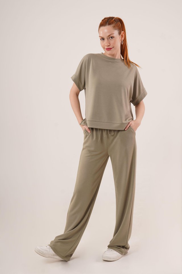 Modal Kısa Kollu Üst Ve Geniş Paça Eşofman İkili Yağ Yeşili Takım