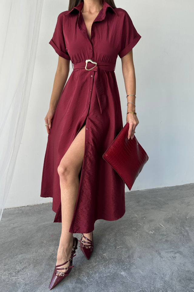 ÖNDEN DÜĞMELİ CRUSHLI MODAL ELBİSE - Bordo