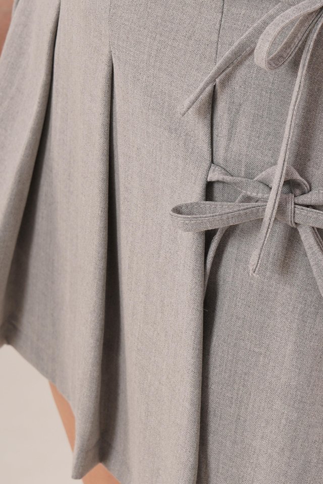 Önü Piliseli Yandan Bağlama Detaylı Gri Mini Şort Etek