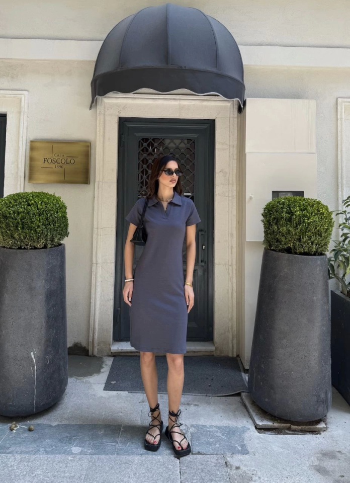 Osy Modal Yumuşak Dokulu Kumaş Yakalı Kısa Kollu Elbise - Füme