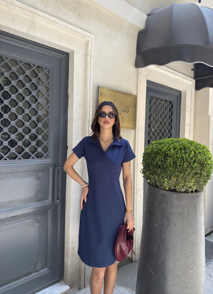 Osy Modal Yumuşak Dokulu Kumaş Yakalı Kısa Kollu Elbise - Mavi