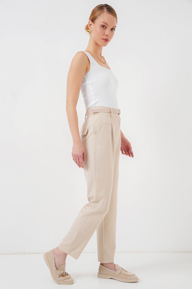 Pileli Kemerli Kumaş Pantolon 6725 - Krem