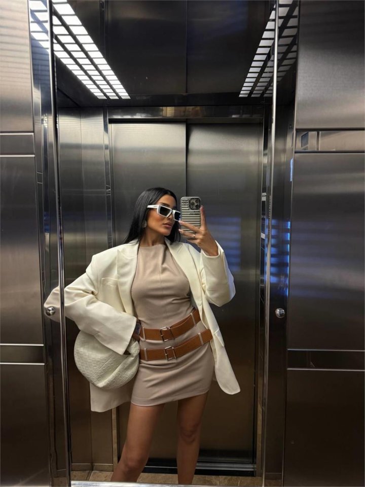 POLYVİSCON ÇİFT KEMER DETAYLI ELBİSE - Bej