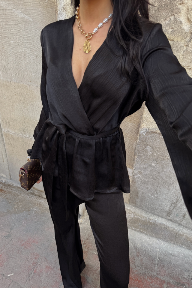SATEN KRUVAZE BAĞLAMALI BLUZ- PANTOLON TAKIM - Siyah