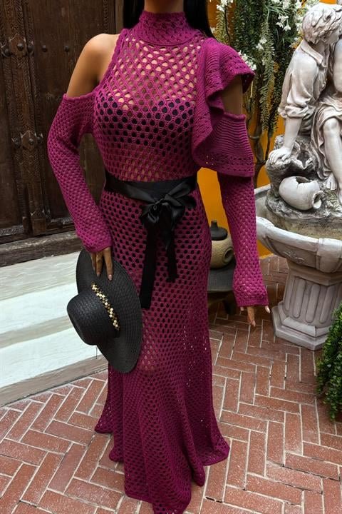 Saten Kuşaklı Ajurlu Triko Elbise 2847