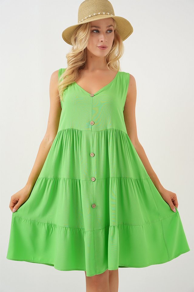 Sıfır Kol Düğmeli Kısa Elbise 2571 - Yeşil
