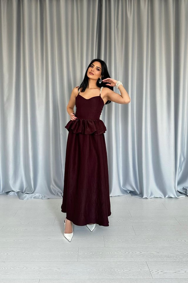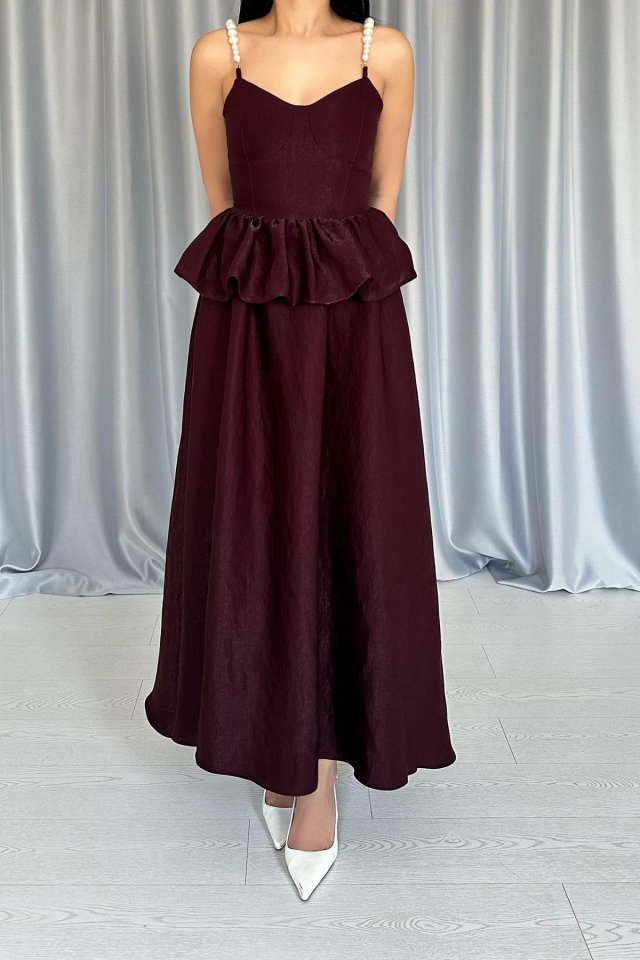 Siyah Beli Büzgülü İnci Askılı Uzun Elbise