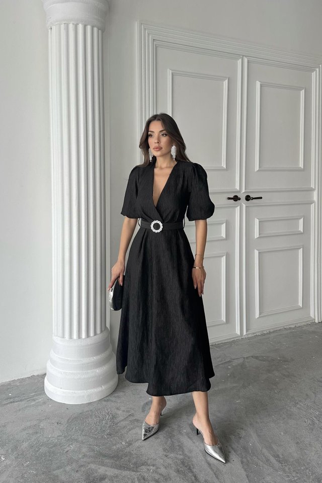 Siyah Işıltılı Kemerli Kruvaze Elbise