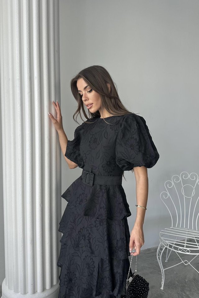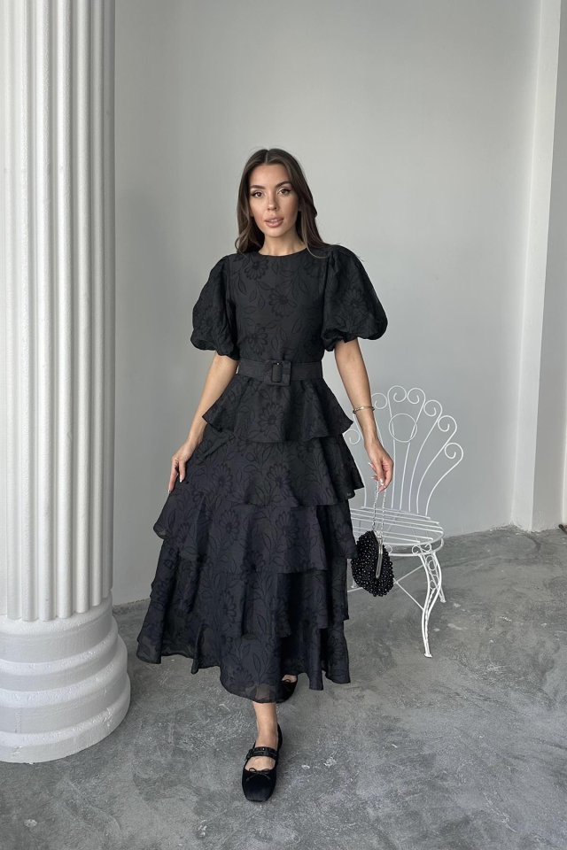 Siyah Kat Kat Balon Kollu Kemerli Elbise