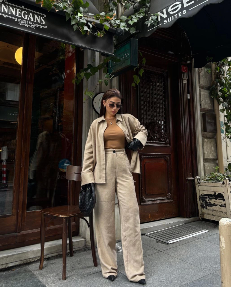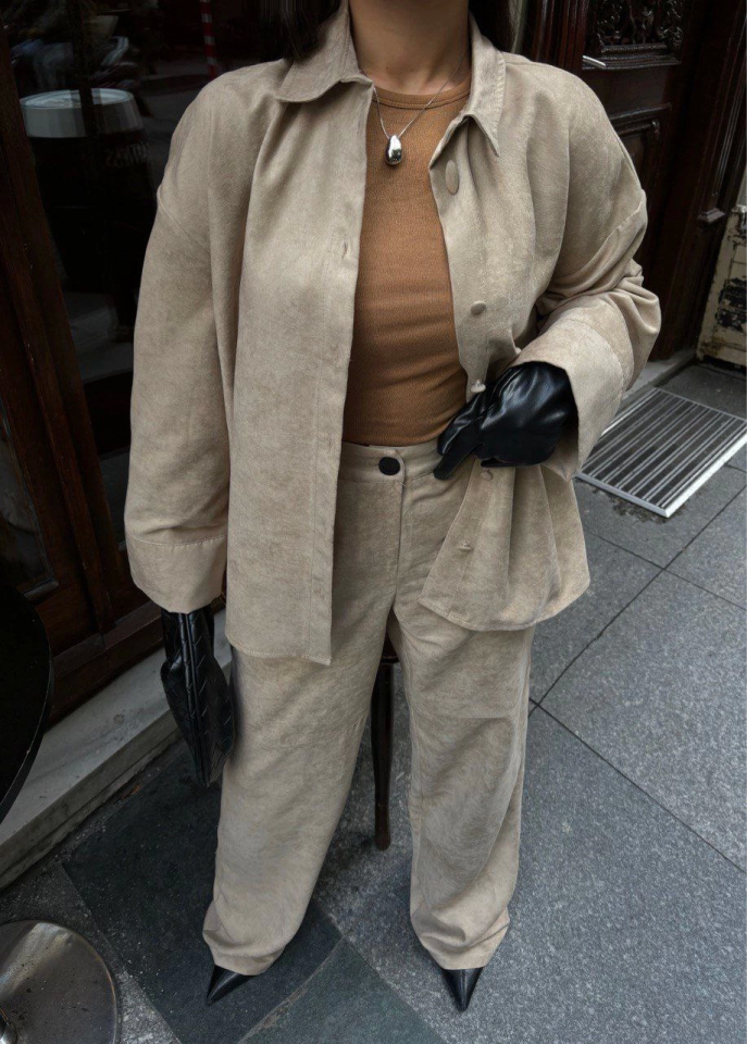 Süet Gömlek Palazzo Pantolon İkili Takım - Bej