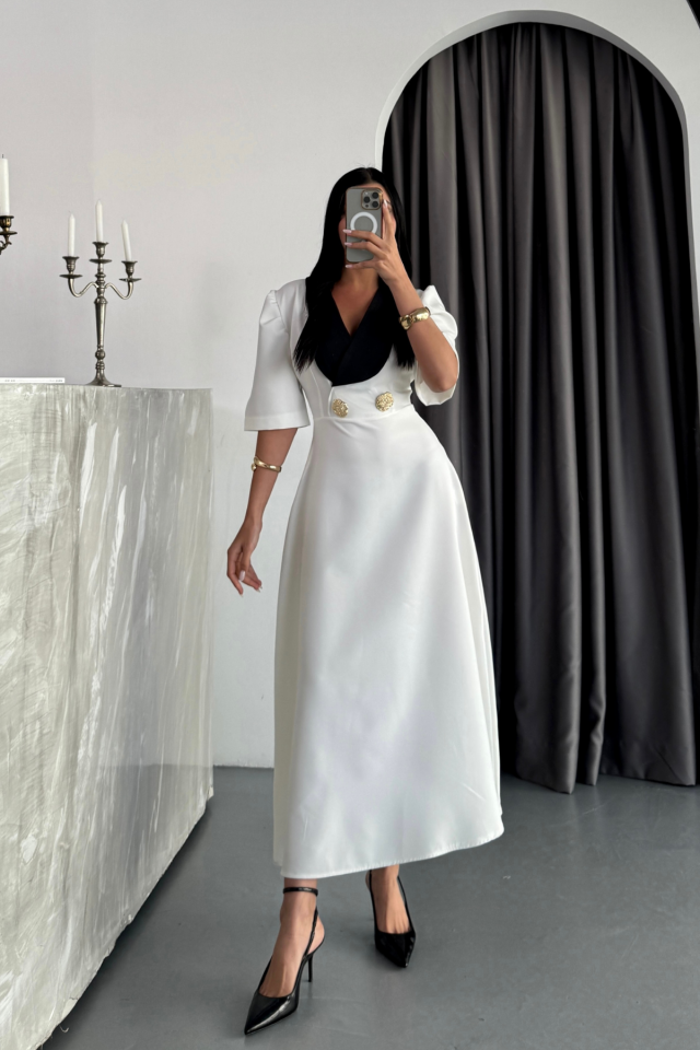 TASARIM ELBİSE CEKET YAKA GOLD DÜĞME DETAYLI KISA KOL - Beyaz