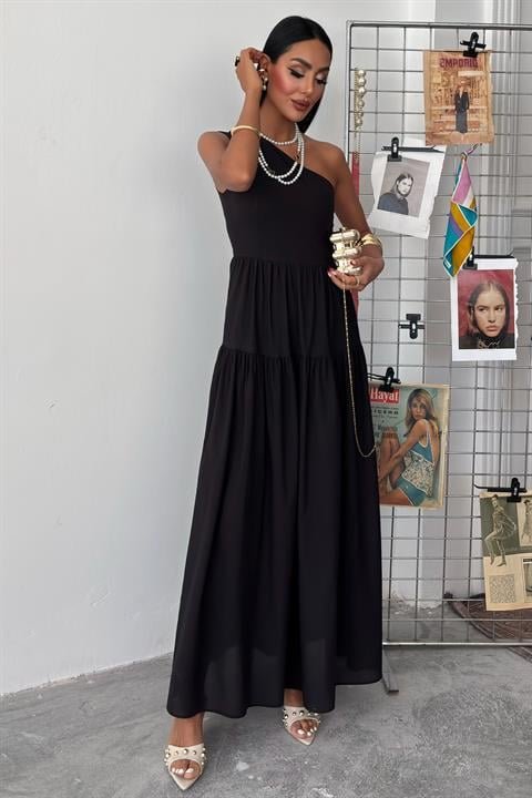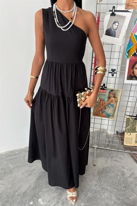 Tek Omuzlu Pile Detay Maxi Elbise 2895