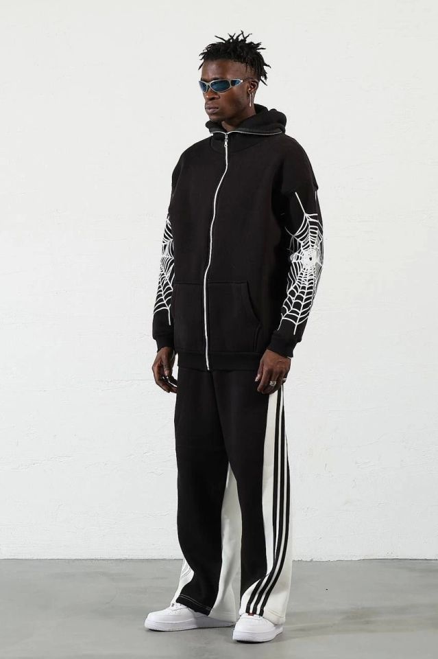 Üç İplik Baskılı Fermuarlı Kapşonlu Hırka - Siyah