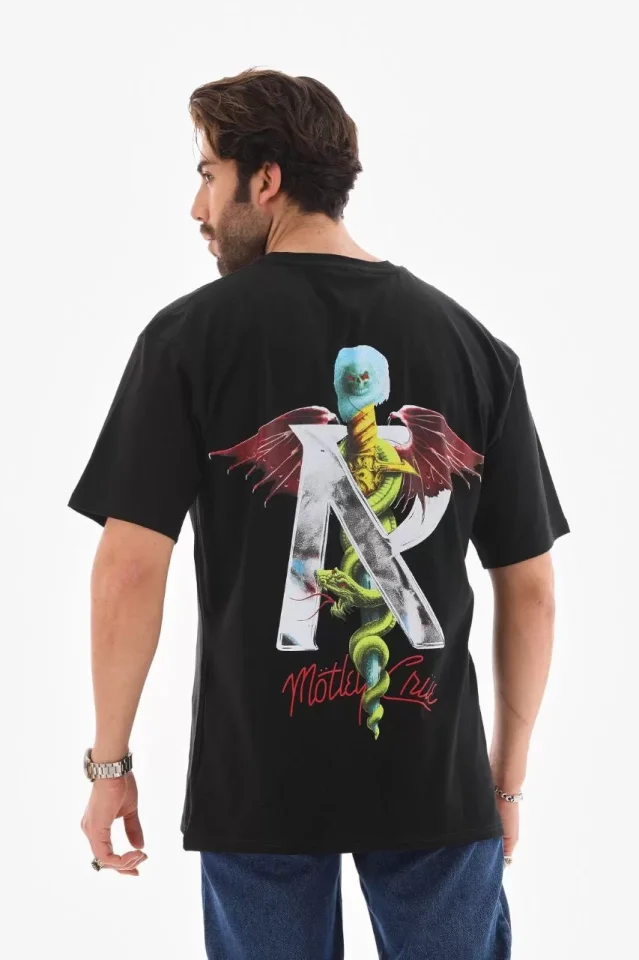 Unisex Bisiklet Yaka Baskılı Oversize T-Shirt - Siyah