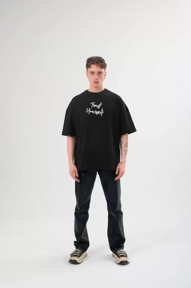 Unisex Bisiklet Yaka Baskılı Oversize T-Shirt - Siyah