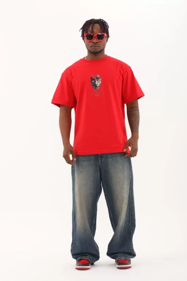 Unisex Oversize Baskılı Bisiklet Yaka T-Shirt - Kırmızı