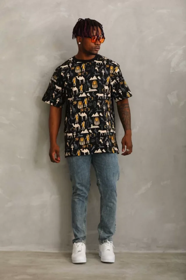 Unisex Oversize Baskılı Bisiklet Yaka T-Shirt - Siyah
