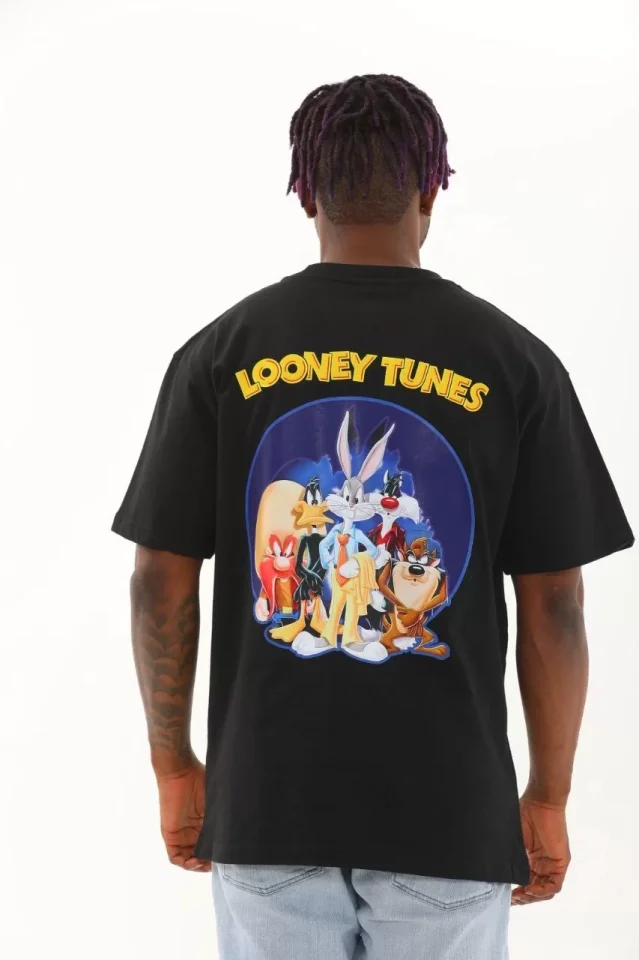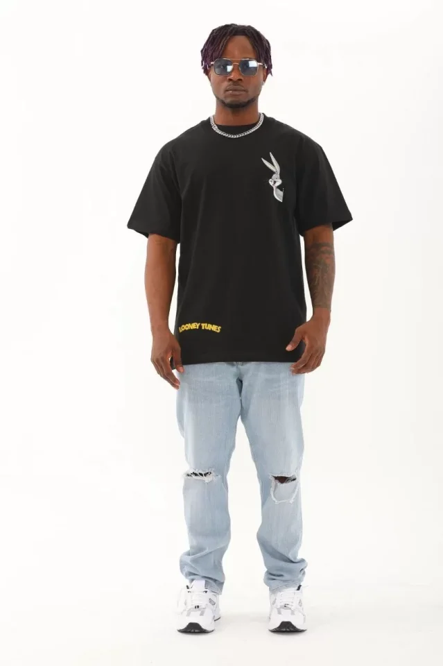 Unisex Oversize Baskılı Bisiklet Yaka T-Shirt - Siyah