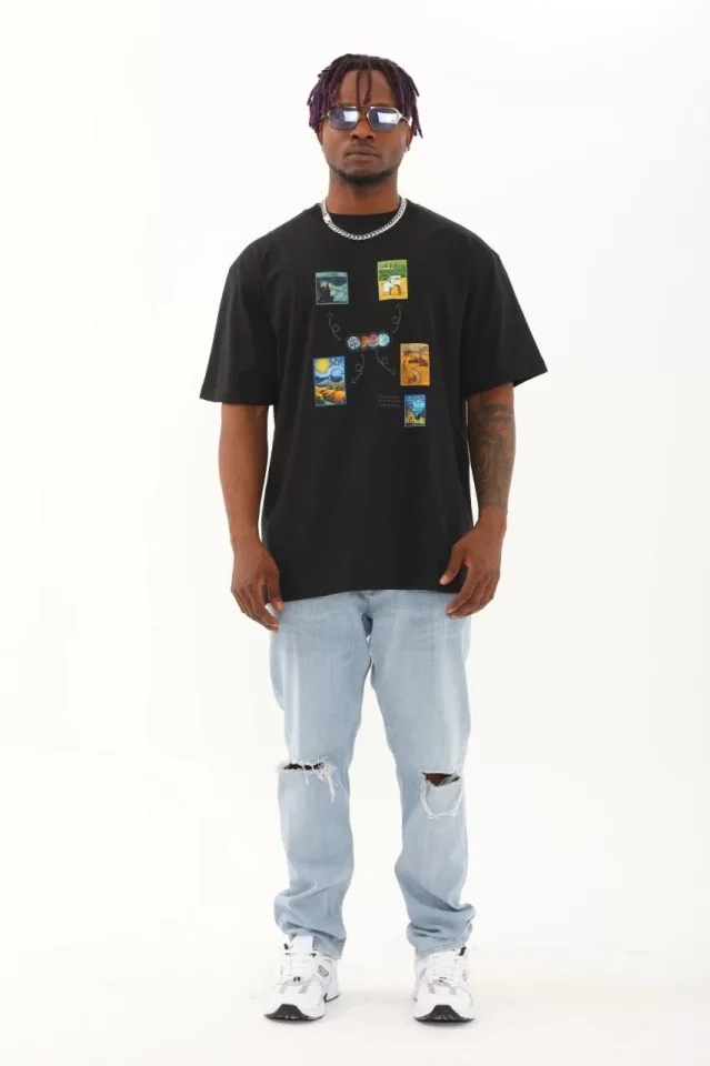Unisex Oversize Baskılı Bisiklet Yaka T-Shirt - Siyah