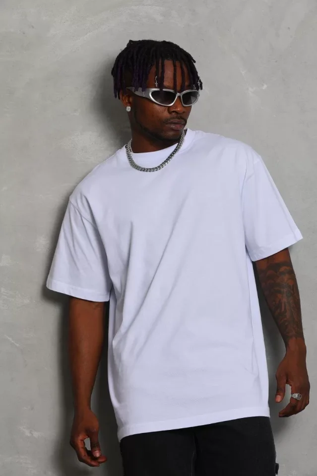 Unisex Oversize Düz Bisiklet Yaka T-Shirt - Beyaz