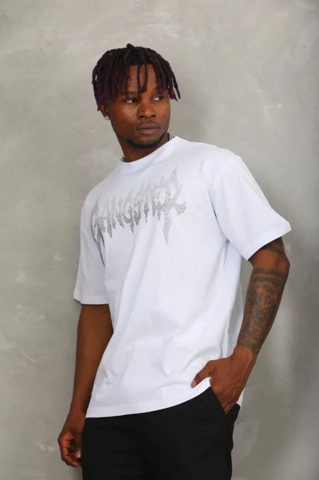 Anasayfa Erkek Unisex Oversize Taşlı Bisiklet Yaka T-Shirt - Beyaz