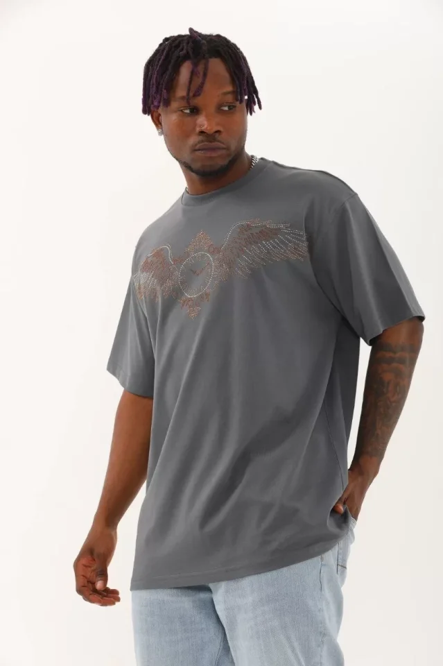 Unisex Oversize Taşlı Bisiklet Yaka T-Shirt - Füme