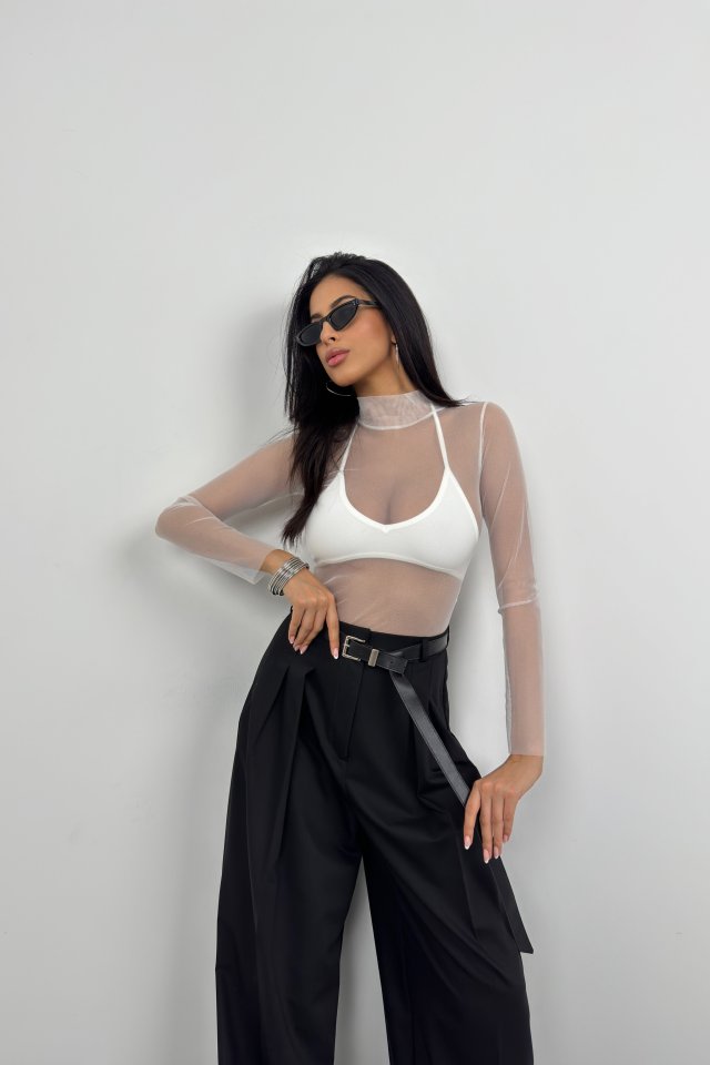 Uzun Kol Boyunlu Tül Bluz