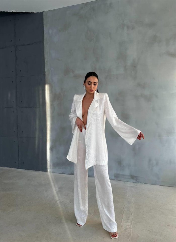 VİSKON JAKARLI BAĞLAMALI GÖMLEK - PANTOLON TAKIM - Beyaz