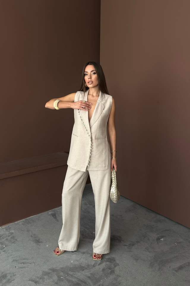 YAKA MİDYE KABUĞU SIRALI YELEK - PANTOLONTAKIM KETEN KUMAŞ - Ham
