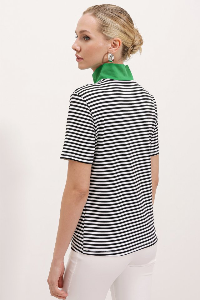 Yeşil Polo Yaka Fermuarlı Çizgili Tişört 0497